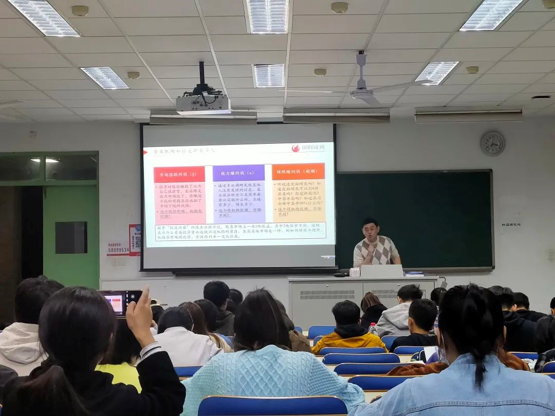 讲座开始,陈老师首先向同学们提出了“为何要投资”这个问题,并举出了“锻炼专业素养”、“增加个人收入”等原因,帮助同学们打开了思路。同时,陈老师的课件加入了网络流行语和经典影视形象等内容,使得严肃刻板的讲座变得幽默亲切。