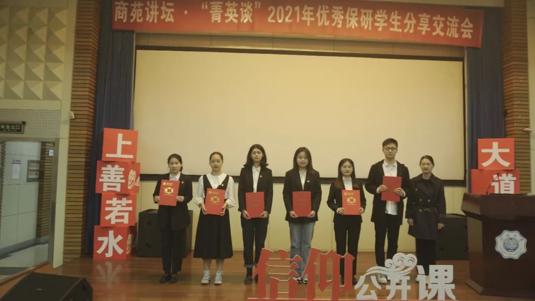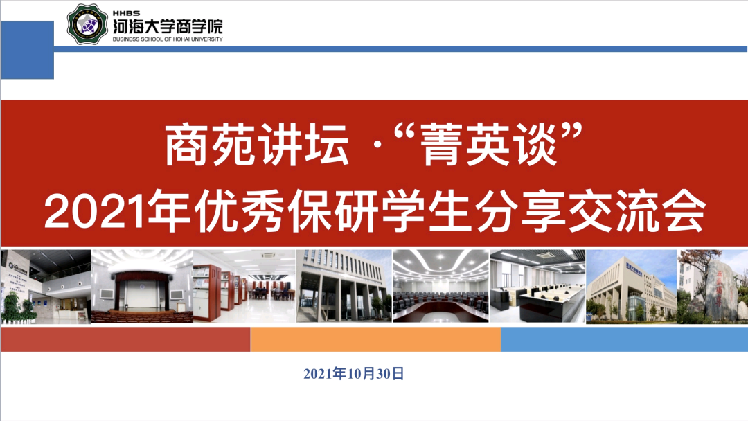 遇见商院,预见未来。为加强学风建设,发挥榜样带头作用,引导在校学生刻苦学习、积极探索,培养素质过硬、能力出众的商学人才,商学院设立商苑讲坛系列活动,商苑讲坛分为大咖谈、精英谈、师长谈、菁英谈四个模块。2021年10月30日晚,商学院学生会学习部于江宁会议中心组织举办商苑讲坛·“菁英谈”2021年优秀保研学生专题分享会。