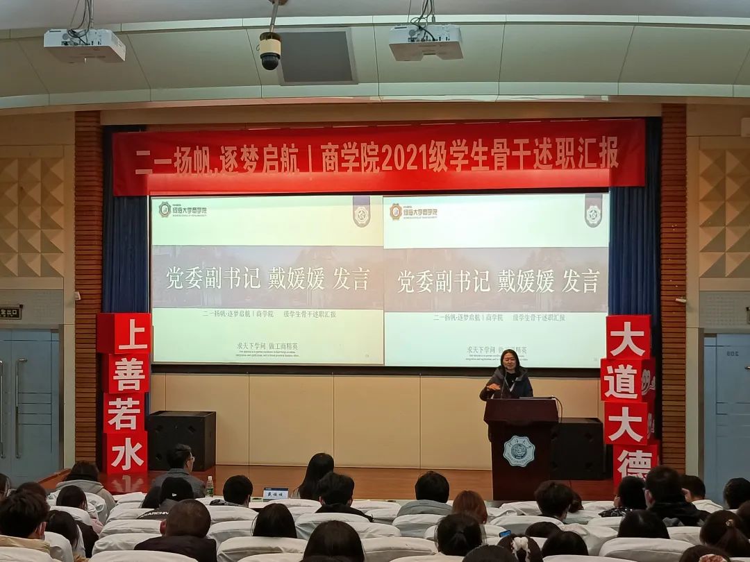 商学院党委副书记戴媛媛受邀参加活动并做总结讲话,2021级辅导员陈鹏、魏俊美,2021级助学导师,校“先进班级体”学生代表刘佳慧,以及2021级全体学生骨干、各班级学生代表参加本次会议。
