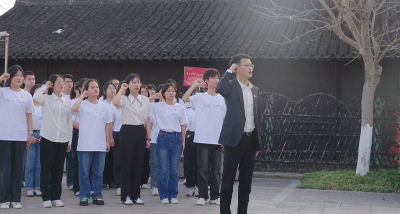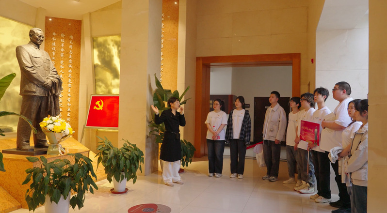 座谈交流会后,学生代表在张闻天铜像前敬献鲜花,表达对张闻天先生的尊敬与缅怀。在商学院2021级辅导员陈鹏老师的带领下,党员同志在誓词墙前重温入党誓词,牢记初心使命。最后,同学们从张闻天的事迹中汲取力量,在故居的各个角落喊出“传承有我”的誓言,将传承闻天精神的坚定信念布满这个岁月沉淀的地方,以青年之声诉说百年星火传承。