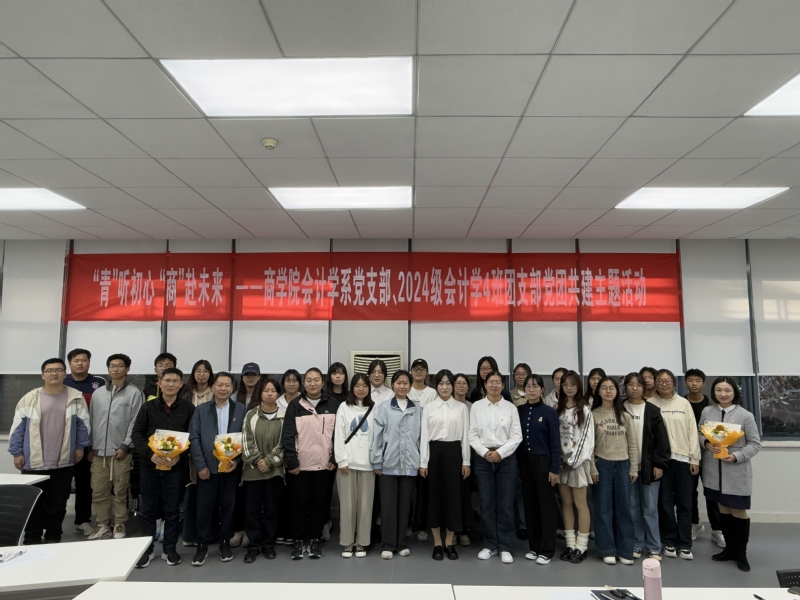 为了帮助新生更好地融入大学生活,明确未来发展方向,提高班级凝聚力,11月5日下午,商学院会计学系党支部、2024级会计学4班团支部联合开展“‘青’听初心 ‘商’赴未来”党团共建主题活动。活动围绕“初心”二字,从新生、青年、教师、“五老”四大主体出发,立足商院共赴美好未来。商学院会计系退休老教师代表许纪校老师、会计学党支部书记新夫老师、会计学系汪佑德老师和杨鑫老师、学院团委书记陈璐老师、2024级辅导员赵晨洁老师以及2024级会计学4班团支部全体同学参加本次活动。