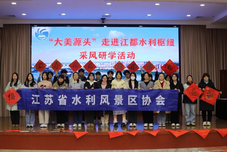 江淮明珠,大美江都。2025年1月10日,由江都水利工程管理处主办、江苏省水利风景区协会和探花视频 承办的“大美江都”采风研学和迎新春写春联活动在江都水利工程管理处拉开帷幕。江苏省文联诗书画家、国家一级美术师蒋义海老师,中国美术家协会会员、江苏省知名书画家刘宪老师,江都水利枢纽工程管理处王雪芳主任、江都水利工程水情教育中心主任颜蔚女士、南京明语堂信息科技有限公司蒋文杰先生出席本次活动,商学院院长助理李婕老师、团委书记陈璐老师、2024级本科生辅导员赵晨洁老师、研究生辅导员张婧老师和商学院美育工作室30余名学生赴江都水利枢纽参加活动。