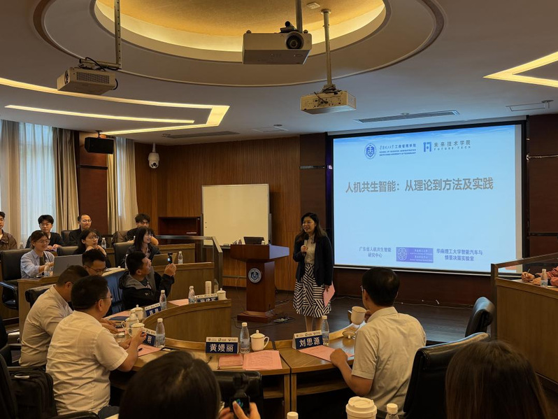 在华南理工大学,代表团参加了“博学论坛”与“明辨论坛”,与华南理工大学工商管理学院相关专家学者开展交流。在“博学论坛”中,代表团聆听了刘思源教授主讲的《人机共生智能:高质量发展的新范式与应用实践》讲座,系统学习了人机协同在产业转型中的理论框架与实践路径,深入理解了智能技术对推动高质量发展的重要作用。在“明辨论坛”中,代表团聆听“科研之星”、多次国家奖学金获得者张楠博士分享自身在绿色供应链运营领域的研究成果,并围绕研究设计、方法创新与学术发表等话题展开深入讨论,牛保庄教授参与点评并与学子互动交流,激发了同学们对智能技术与可持续发展路径的深入思考。
