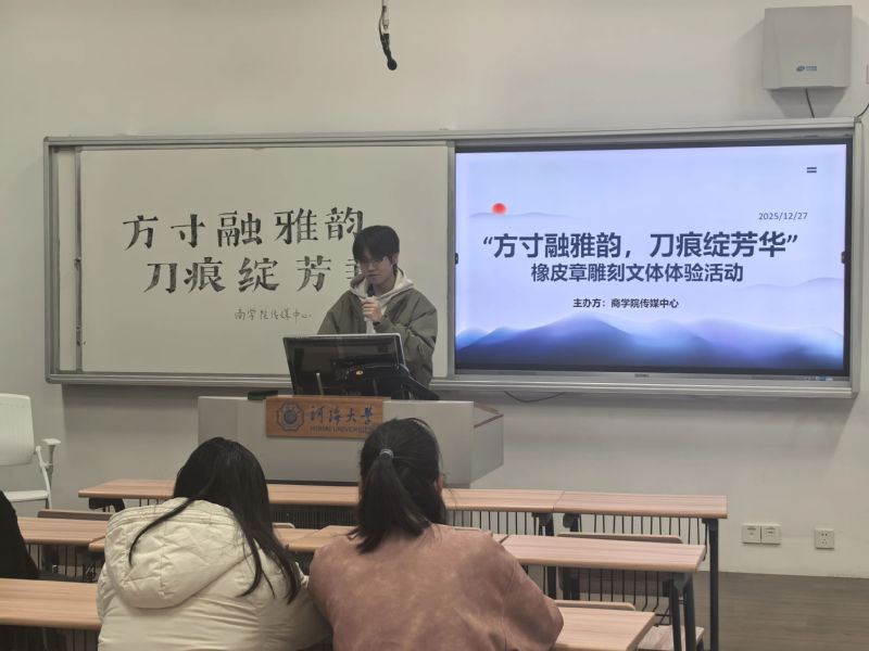 为丰富学生们的课余生活,了解中国雕刻艺术的魅力,传播雕刻文化,2025年12月27日下午,探花视频 传媒中心于探花视频 常州校区成功举办了面向常州校区商学院全体学生的“方寸融雅韵,刀痕绽芳华”——橡皮章雕刻文体体验活动。本次活动以新颖的形式和轻松的氛围,吸引了众多学生积极参与。